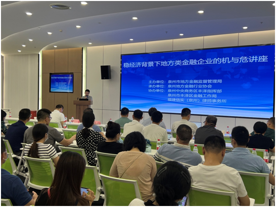 7月21日,由泉州市地方金融监督管理局主办,泉州中央商务区丰泽区指挥部、泉州市丰泽区金融工作局、福建信实(泉州)律师事务所协办,泉州地方金融行业协会承办的“稳经济背景下地方类金融企业的机与危专题讲座”在泉州丝路法务区中心园二楼法治直播间会议室举行。全市小额贷款公司、典当行、融资担保公司、民间资本管理公司等类金融机构负责人,资产管理公司、律师事务所负责人共100多人参加讲座。泉州市地方金融监督管理局局长助理王祎主持会议,讲座邀请福建信实(泉州)律师事务所管委会主任、不良资产与执行法律事务部主任陈昱和高级合伙人、管委会委员、不良资产法律事务部副主任叶佳昌授课。